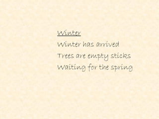 Poetry uses elements like figurative language, sound devices, rhythm, and style to convey moods and emotions through imagery and the expression of thoughts. It can take many forms through elements like similes, metaphors, personification, alliteration and more. Successful poems create pictures and feelings in the reader's mind through carefully chosen words.