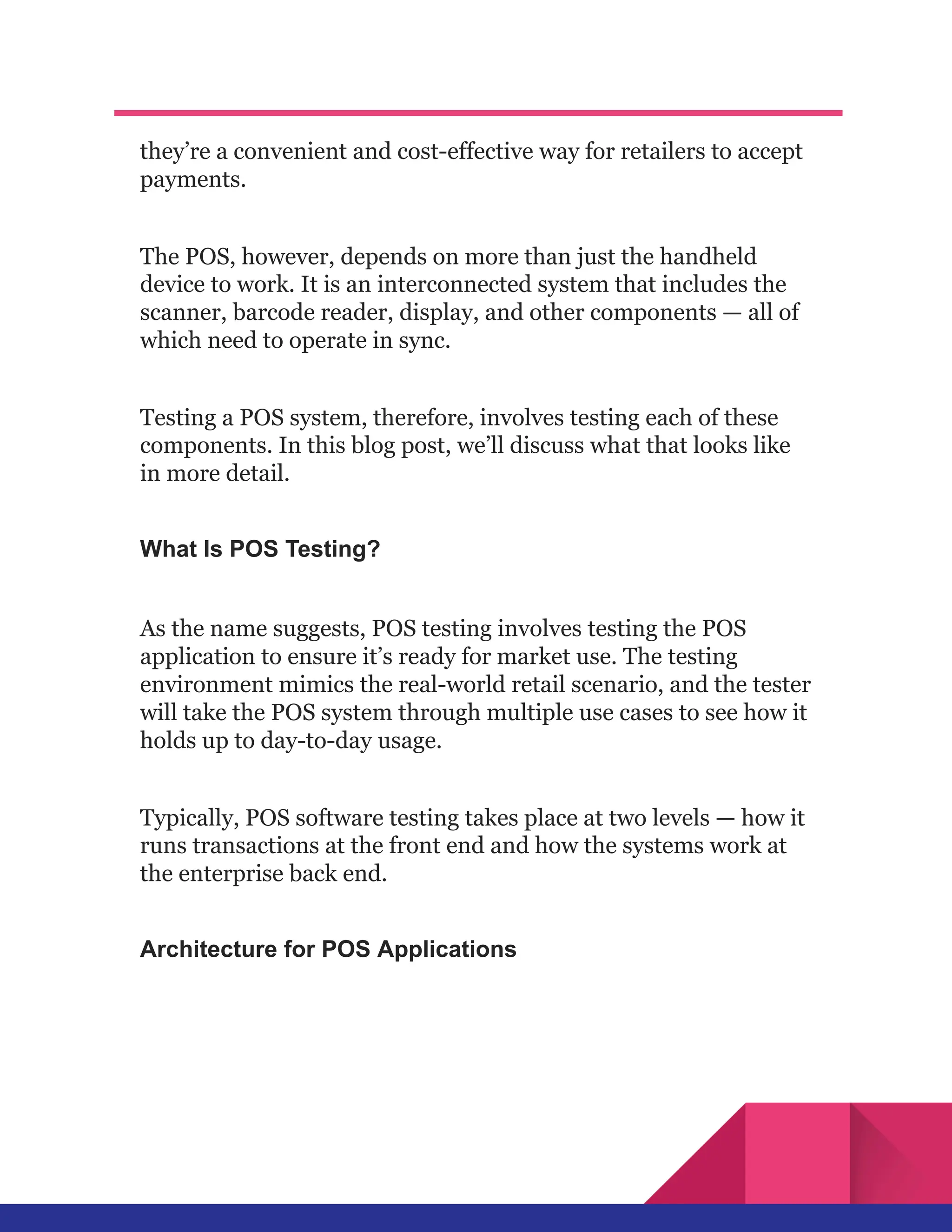 This document outlines the significance of Point of Sale (POS) testing, detailing its architecture, types of testing, and the critical need for rigorous testing to prevent operational failures. It emphasizes various testing levels, including application and enterprise components, while discussing specific physical components of POS systems, their functions, and testing methodologies. Additionally, it highlights trends in POS technology, such as AI and mobile systems, and the necessity for evolving testing strategies to keep pace with innovations.