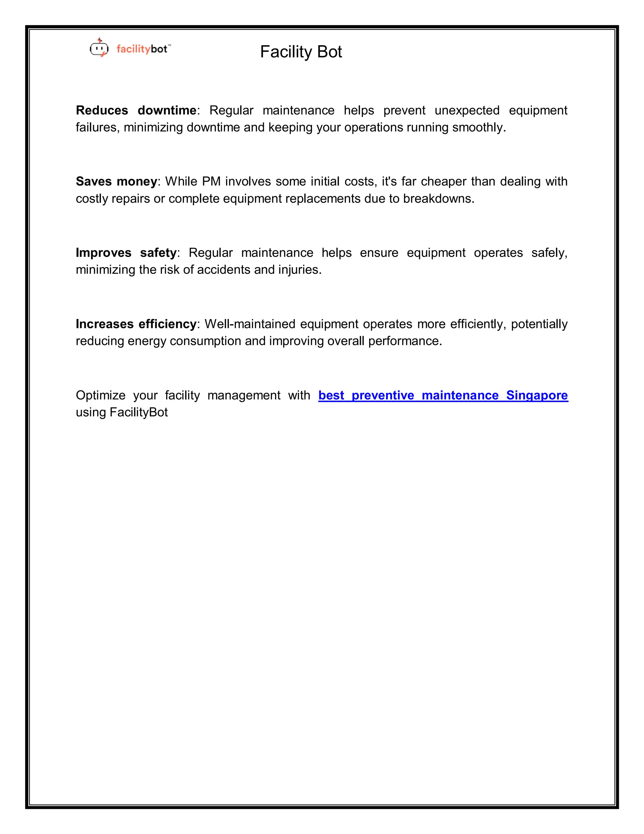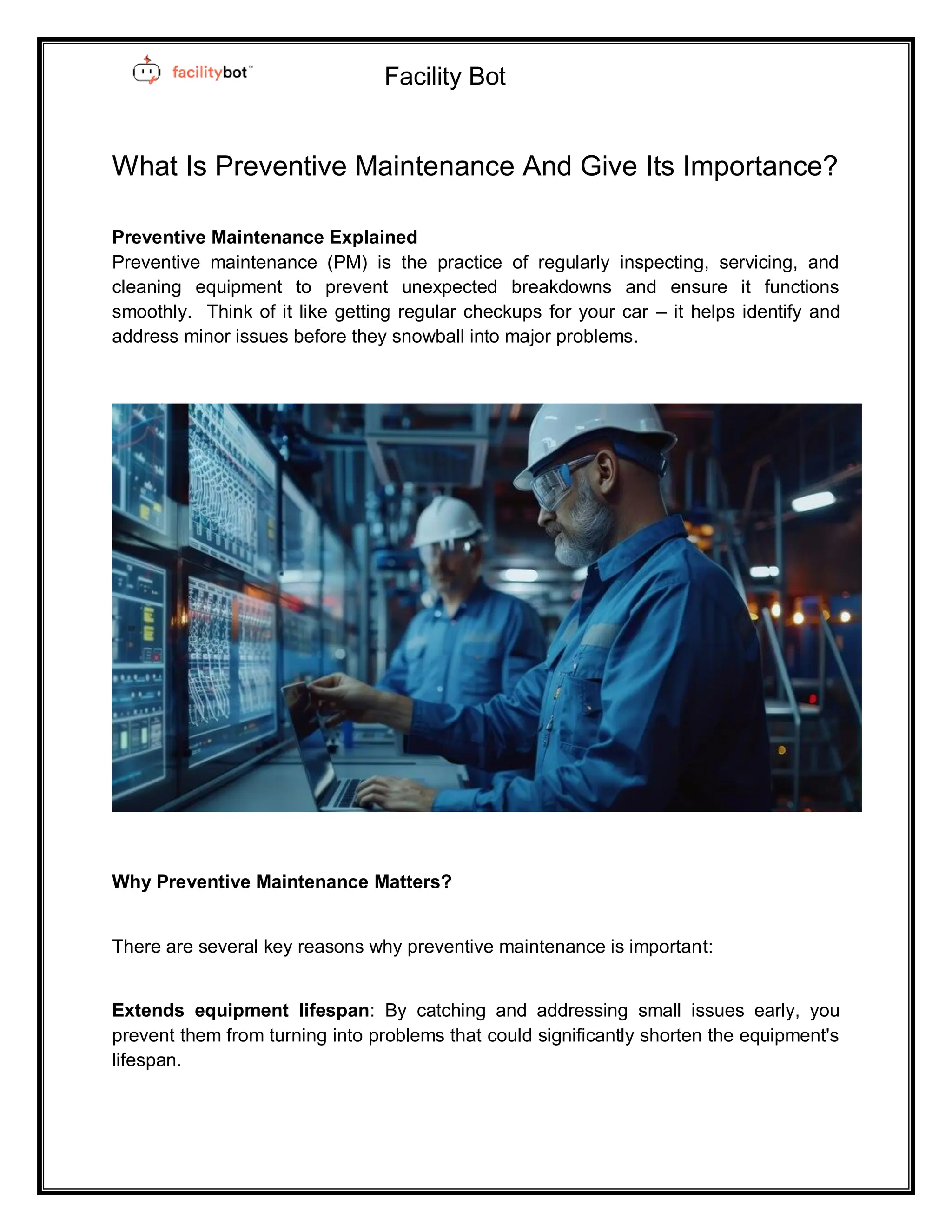 Preventive maintenance is the proactive upkeep of equipment through regular inspections and servicing to prevent potential failures. By identifying and addressing issues before they lead to breakdowns, preventive maintenance reduces costly repairs, minimizes unplanned downtime, and extends the lifespan of assets. It also improves workplace safety, energy efficiency, and operational costs, while allowing for better planning and scheduling of maintenance activities. Ultimately, preventive maintenance is crucial for maintaining equipment reliability, productivity, and a positive brand image. To know more visit us : https://facilitybot.co/features/preventive-maintenance