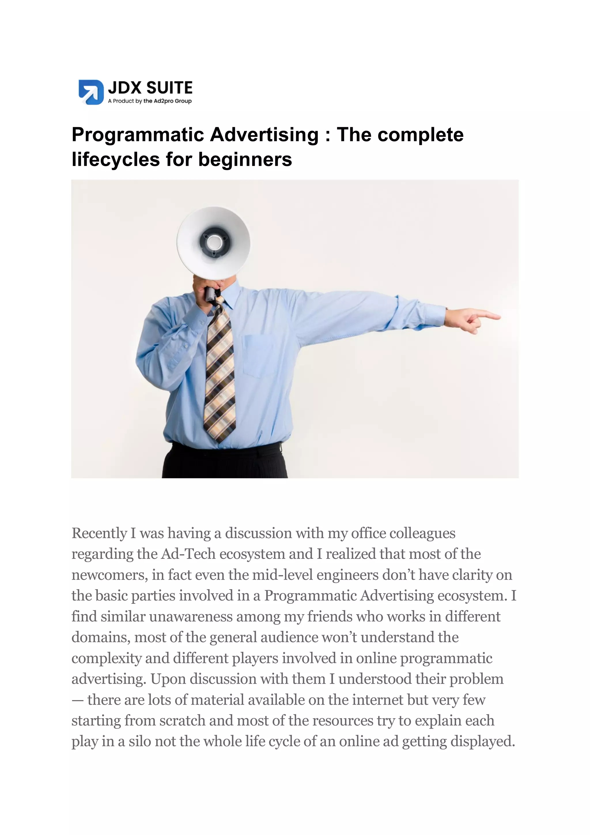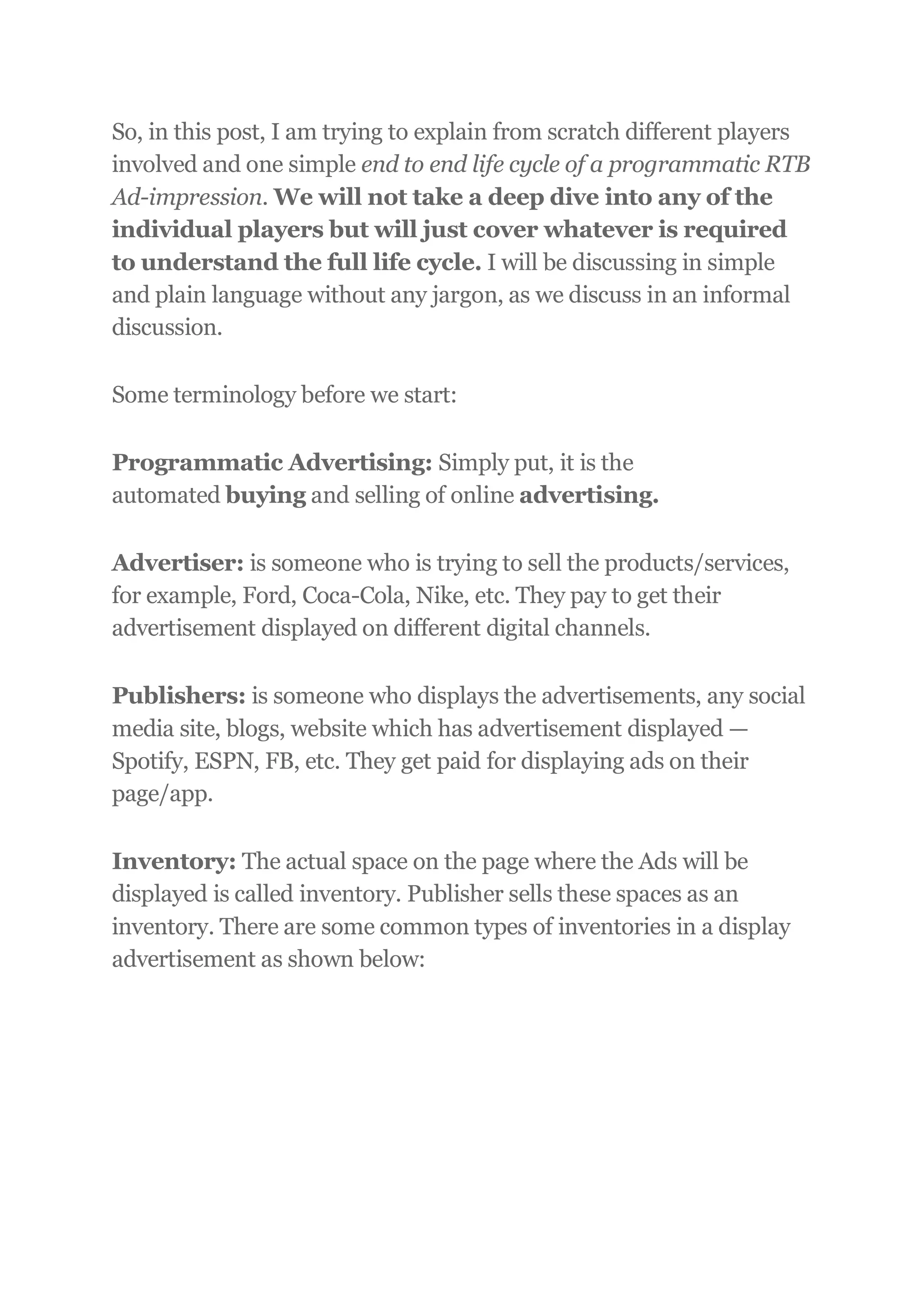 This document provides a high-level overview of the key players and life cycle involved in programmatic advertising. It begins with one advertiser (Nike) and one publisher (ESPN) directly working together. However, as the number of advertisers and publishers grow, intermediaries emerge to connect them more efficiently. This includes ad networks that aggregate inventory from multiple publishers, and supply side platforms and demand side platforms that help publishers and advertisers/agencies respectively to buy and sell inventory programmatically in real-time bidding auctions via ad exchanges. The document walks through a simplified end-to-end example of how an ad impression is bought and sold from the time a user visits a publisher page to when the ad is displayed on