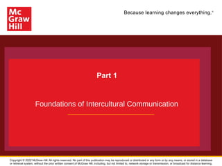 everything.® Part 1 Foundations of Intercultural Communication Copyright © 2022 McGraw Hill. All rights reserved. No part of this publication may be reproduced or distributed in any form or by any means, or stored in a database or retrieval system, without the prior written consent of McGraw Hill, including, but not limited to, network storage or transmission, or broadcast for distance learning.
