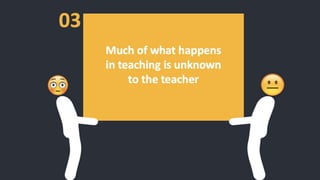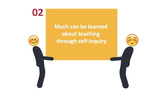 The document discusses reflective teaching principles and practices, highlighting the importance of analyzing and improving teaching methods for better learning outcomes. It emphasizes that reflective teaching fosters continuous improvement, allows educators to explore new ideas, and facilitates collaboration among teachers. The document also outlines the advantages of reflective teaching, including the expansion of understanding and strategies in language teaching, enhancing the quality of learning in classrooms.
