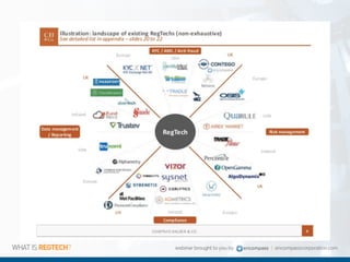 The document discusses the development and significance of regulatory technology (regtech), emphasizing its role in enhancing compliance, governance, and regulatory reporting within financial services. It explains the evolution of regtech from its fintech roots and highlights the various technologies involved, such as blockchain and AI. Furthermore, it predicts that regtech will not only streamline compliance processes but also support informed risk management in the long term.