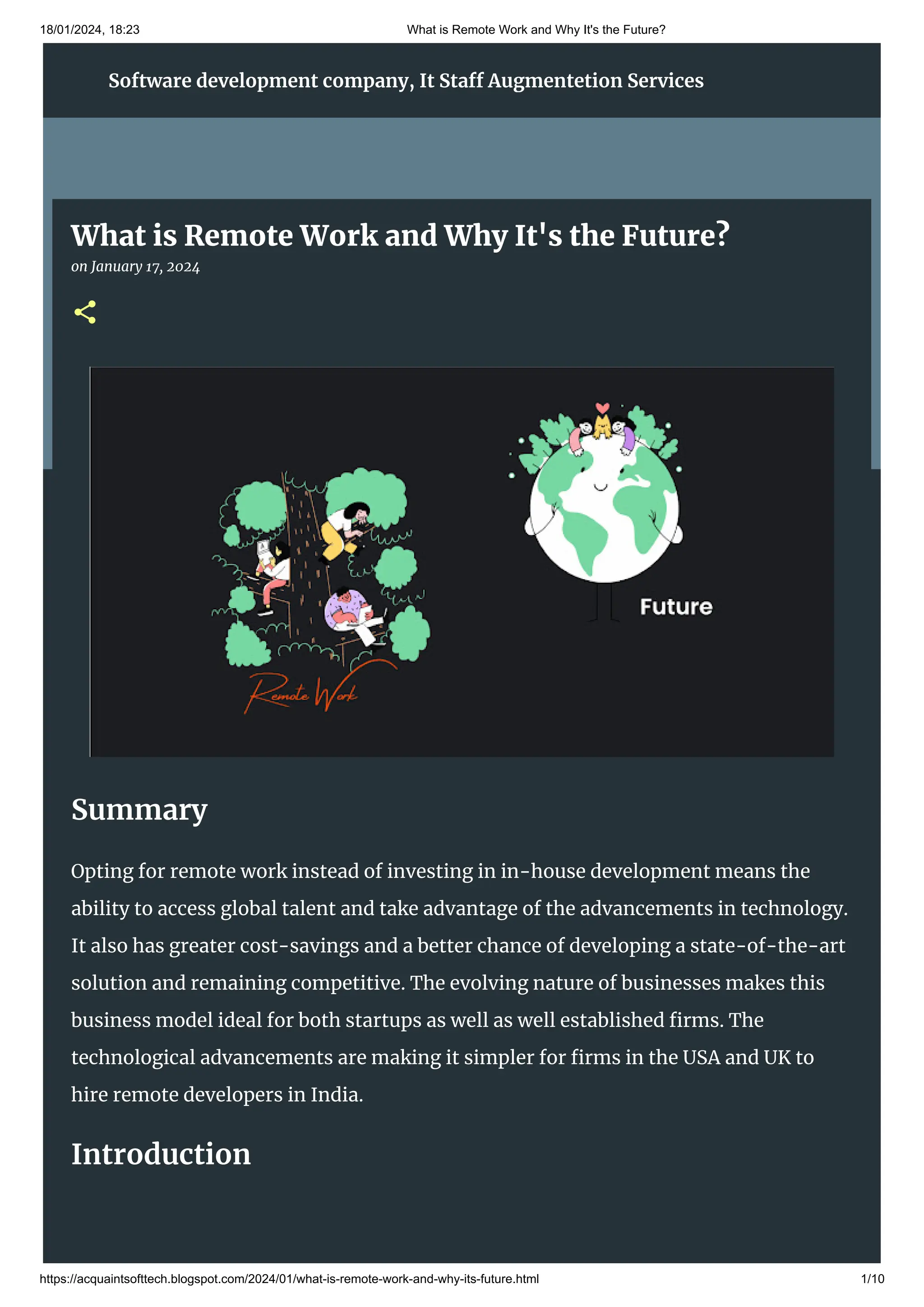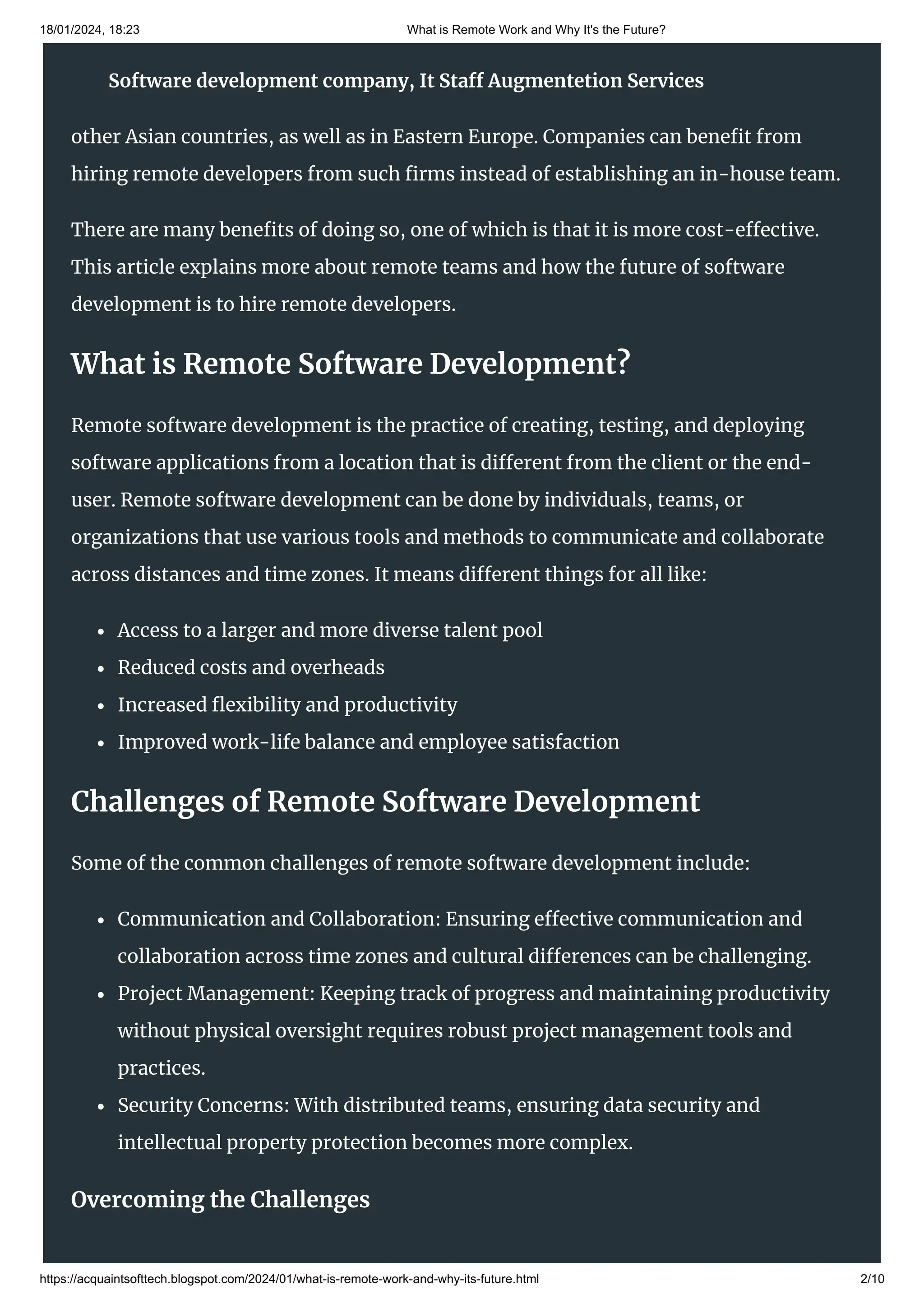 The document discusses the rise of remote work in software development, highlighting its benefits such as access to global talent, cost savings, and increased flexibility for businesses. It outlines the challenges associated with remote teams, including communication and project management, and emphasizes the importance of effective management tools and practices. Additionally, it notes the growing trend of outsourcing as companies embrace the efficiencies and innovations offered by remote development teams.