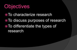 This chapter discusses research, its objectives, and characteristics. It defines research as a systematic inquiry that uses disciplined methods to answer questions or solve problems. The key characteristics of research discussed are that it is systematic, objective, feasible, empirical, and clear. Research involves following a system for writing chapters and composing them in a logical, organized manner. It also requires researchers to objectively analyze phenomena, ensure problems studied are relevant to their field, present evidence to support variables, and clearly explain their variable selection. The roles of researchers discussed are as principal investigators, members of research teams, identifiers of problems, evaluators of findings, users and advocates of findings, and subjects of studies.