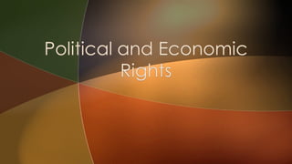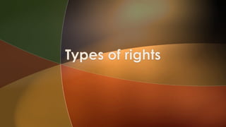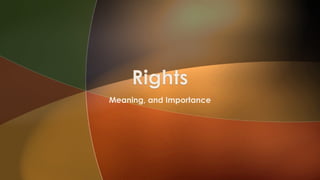 This document discusses the meaning and importance of rights. It defines rights as conditions granted by the state for public welfare. Rights can be positive or negative and every right corresponds to a duty. The document then classifies rights into moral rights and legal rights. Moral rights are based on ethics while legal rights are recognized and enforced by law. It provides examples of different types of legal rights like civil rights, political rights, and economic rights. It also discusses the fundamental rights granted by the Indian constitution like right to life, equality, freedom of speech and religion.