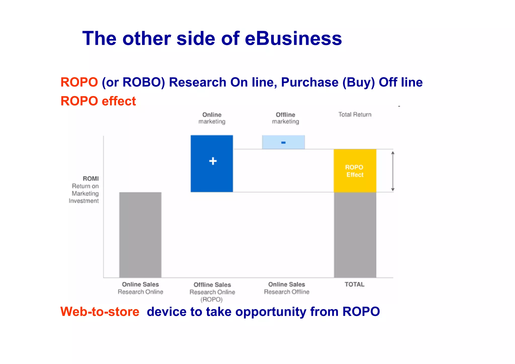 The document discusses the concept of ROPO (Research Online, Purchase Offline) and its significance in the evolving retail industry, particularly in the U.S. It highlights key statistics showing consumer behavior, with many shoppers researching products online before purchasing them in stores, and outlines motivations and trends behind ROPO. It also provides examples of effective web-to-store strategies that drive in-store traffic and enhance customer experience.