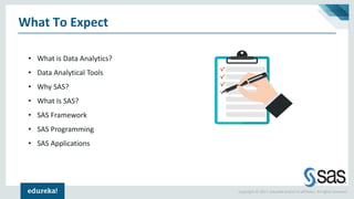 The document discusses SAS (Statistical Analytics System), a software for data management, analytics and visualization. It provides an overview of SAS framework, programming and applications. SAS allows users to access, manage and analyze data, and then present results. It discusses key SAS concepts like data sets, variables, formats and linear regression modeling using SAS procedures. Common applications of SAS mentioned are in domains like stock prediction, drug discovery, fraud detection and workflow optimization.