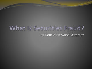 Attorney Donald Harwood has over thirty years of experience in complex civil litigation and criminal defense, particularly in white-collar crimes like securities fraud. Securities fraud encompasses actions such as misleading financial reporting and insider trading, as exemplified by the Enron case. The document also describes 'pump and dump' schemes, where false information is spread to inflate stock prices for profit.