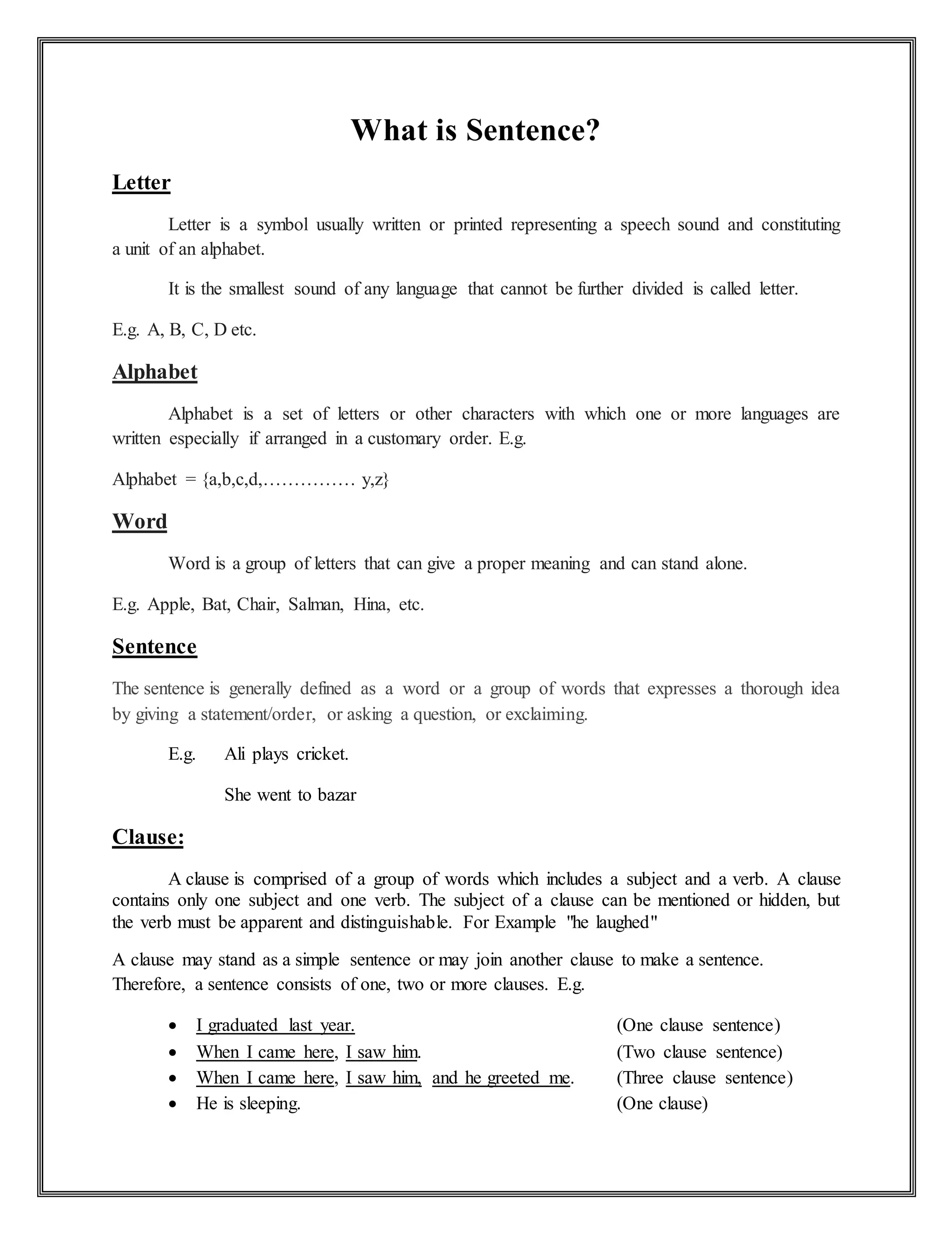 The document explains the foundational concepts of language structure, including definitions and examples of letters, alphabets, words, sentences, clauses, and phrases. It classifies sentences based on their function (declarative, interrogative, imperative, exclamatory) and structure (simple, complex, compound, compound-complex) while also describing independent and subordinate clauses. Overall, it provides a comprehensive overview of how sentences are formed in a language.