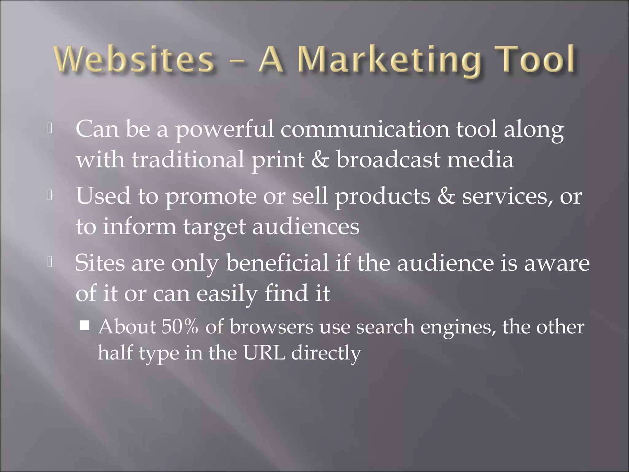 The document discusses the importance of utilizing the web as a communication tool for promoting products and services, emphasizing the need for effective search engine marketing (SEM) strategies that include organic and paid listings. It outlines best practices for website design, keyword research, and search engine optimization (SEO) to enhance visibility and user experience, while also advising against spammy tactics that could lead to being banned from search engines. Additionally, it provides resources and guidelines for navigating paid advertising options and understanding the differences between search engines and directories.