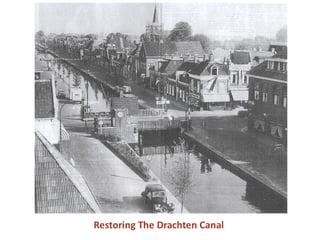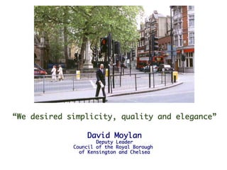 The document discusses the concept of "shared space" in urban design as proposed by Hans Monderman, which aims to prioritize social behavior over traffic regulation. Monderman believed the best public spaces are ones where human behavior, not signs and rules, govern how the space is used. He advocated for a context-time approach focused on diversity and culture rather than a system-time approach that treats streets primarily for vehicle throughput. Case studies in the Netherlands found that shared spaces led to reduced congestion, slower traffic speeds as vehicles yielded to others, and fewer accidents.