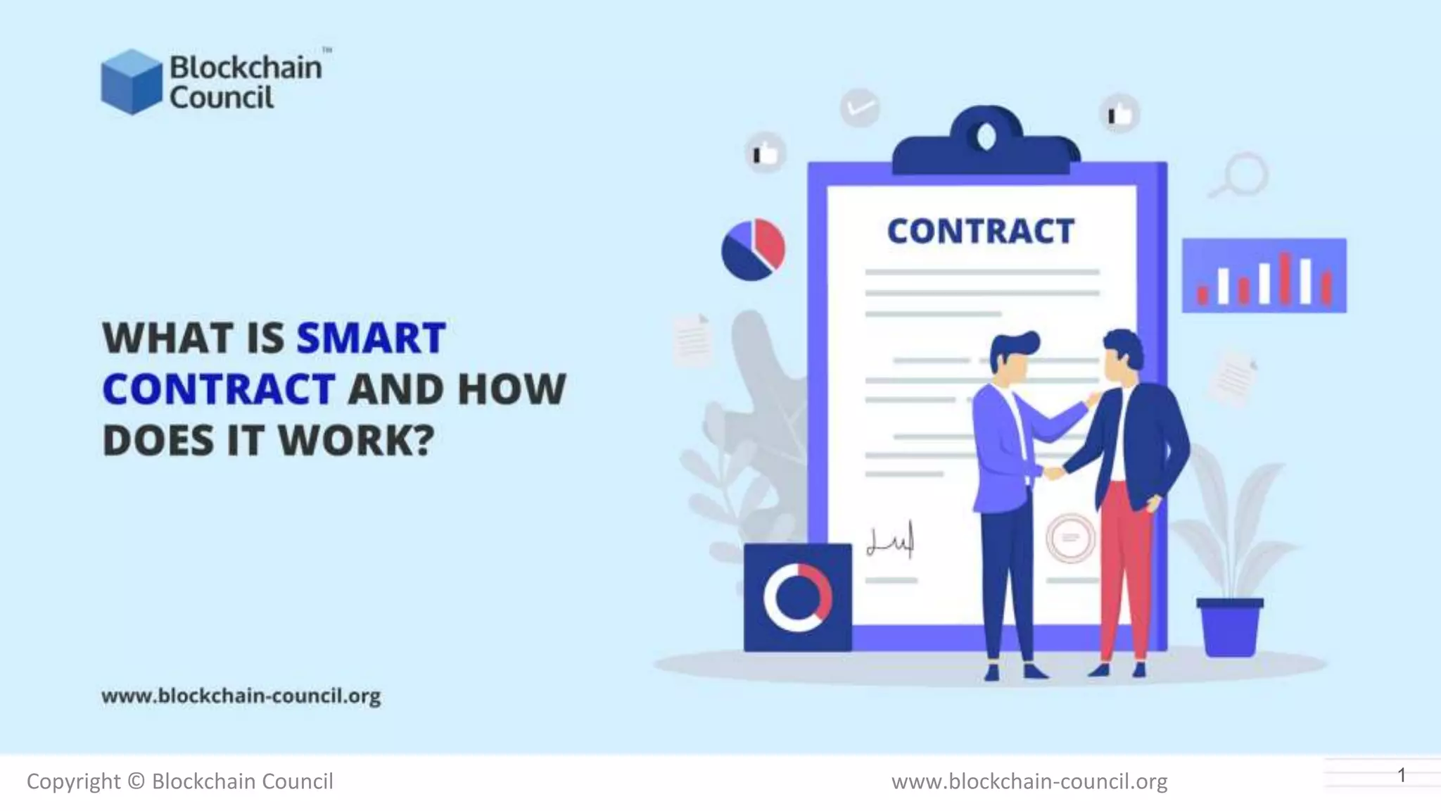 Smart contracts are programs stored on a blockchain that automatically execute the terms of an agreement. They consist of conditions and rules that are triggered when contract terms are met. The concept of smart contracts was first introduced in 1994 as a way to make electronic transactions more transparent and efficient. Today, smart contracts are written in programming languages like Solidity and power applications on blockchain networks, allowing them to automate processes in industries like finance, real estate, and supply chains. The document promotes certification courses from the Blockchain Council for individuals to develop skills in creating smart contracts and building careers in the blockchain field.