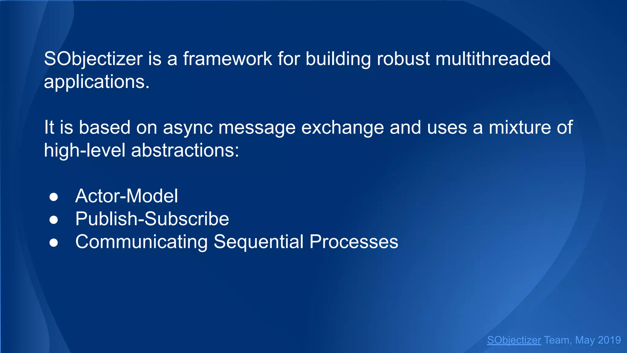 SObjectizer is a framework for building robust multithreaded applications based on the actor model. It uses asynchronous message passing and high-level abstractions like actors, publish-subscribe, and communicating sequential processes. SObjectizer has been in development since the 1990s and is mature, stable, cross-platform, easy to use, and free. It provides features like multiple dispatcher types, hierarchical state machines, and message chains. Developers can build entire applications on SObjectizer or integrate it into other applications.