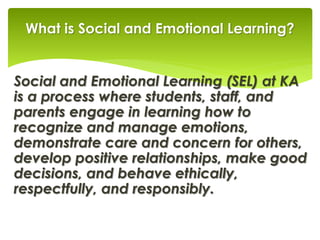 SEL at KA focuses on students, staff, and parents learning to recognize and manage emotions, demonstrate care for others through positive relationships, make good decisions, and behave ethically and respectfully.