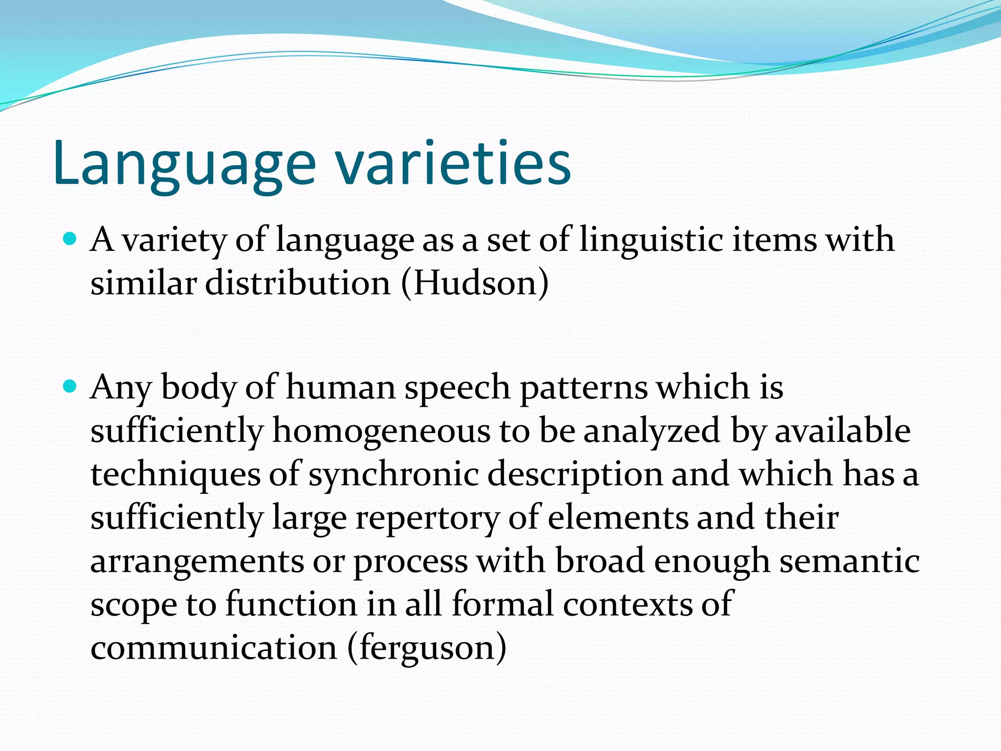 Varieties are sets of linguistic features associated with a group. Dialects differ grammatically and lexically from other varieties and are associated with a social group. Accents only differ in pronunciation. Styles vary based on social situations. Dialect contact from communication between groups can lead to dialect mixture and the formation of new dialects or koines. Registers are varieties associated with topics or activities.