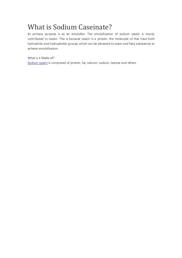 Sodium caseinate is a protein made from casein that acts as an emulsifier. It is composed of protein, fat, calcium, sodium, lactose and others. Sodium caseinate works as an emulsifier because casein molecules have both hydrophilic and hydrophobic groups that can attract to water and fatty substances to achieve emulsification.