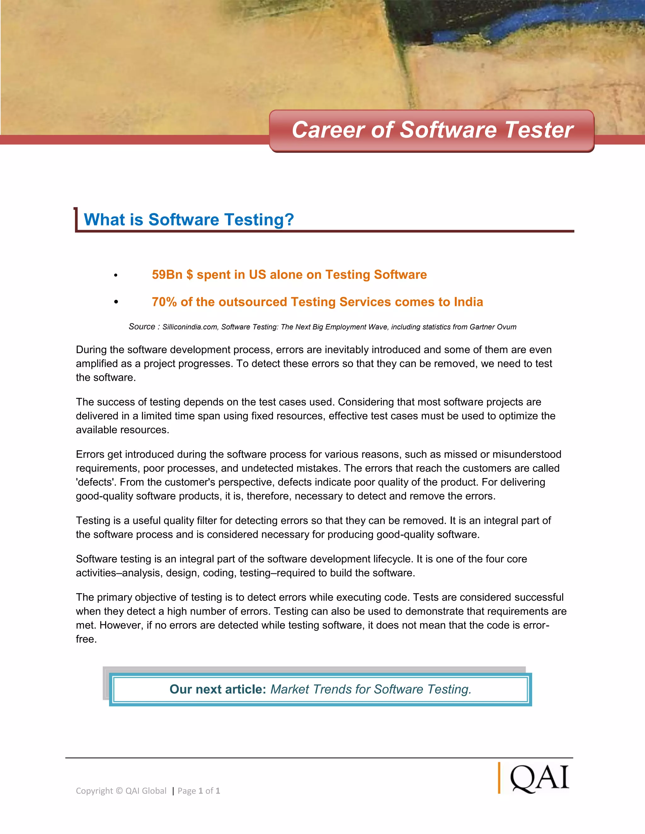 Software testing is a $59 billion industry in the US that helps detect errors introduced during the software development process. Effective test cases are important to optimize limited resources and catch errors before customers encounter defects. Testing is a critical part of the software development lifecycle used to find errors and show requirements are met, though finding no errors does not prove code is perfect. The next article will discuss market trends in software testing.