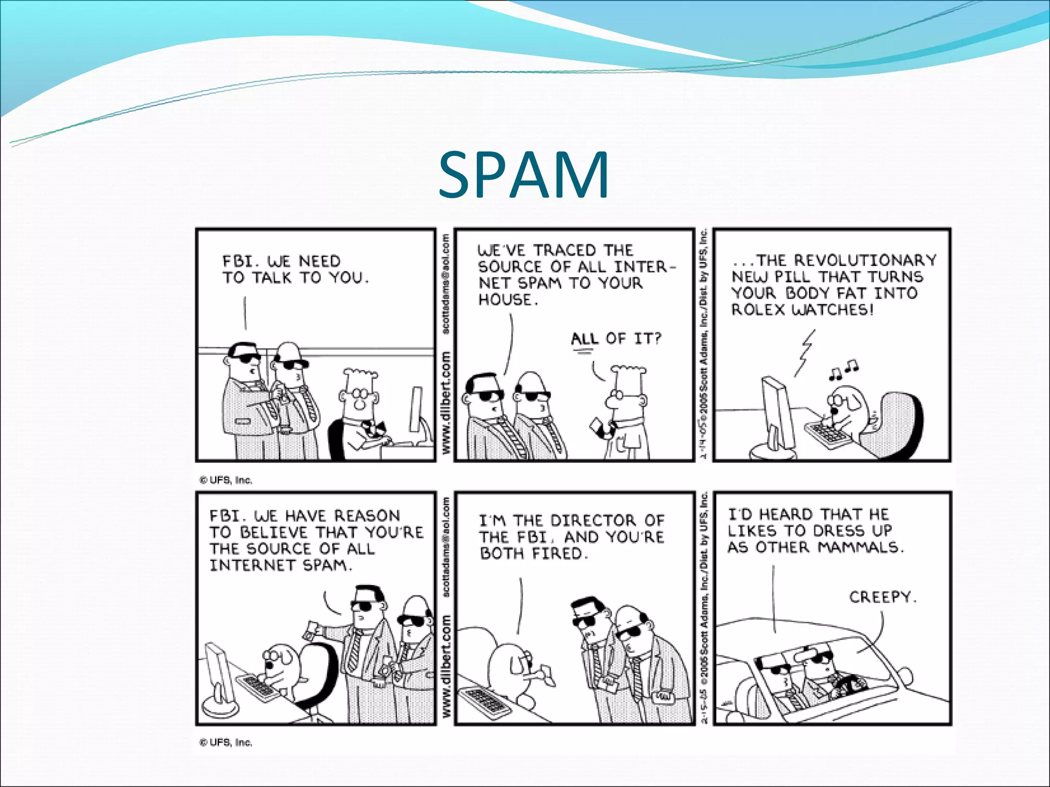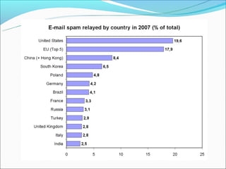 Email spam, also known as junk email or unsolicited bulk email, is a subset of electronic spam that involves sending nearly identical unsolicited messages to numerous recipients. Spam has grown significantly since the early 1990s, with about 80% of spam now sent using botnets. Spammers collect email addresses from various sources and sites to send spam messages advertising products like pharmaceuticals. Fighting spam involves techniques like using email providers that utilize blacklists to block spam, protecting email addresses, and effectively reporting spam messages.