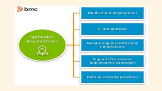 Spinnaker is an open source continuous delivery platform that provides automated deployment capabilities for releasing software changes. It is designed to increase release velocity and reduce risk associated with updating applications. Spinnaker uses a microservices architecture and provides features like multicloud deployments, automated pipelines, deployment verification, and flexibility and extensibility through customization and extensions. It works by managing applications and their deployments through concepts like pipelines, stages, server groups, and deployment strategies.