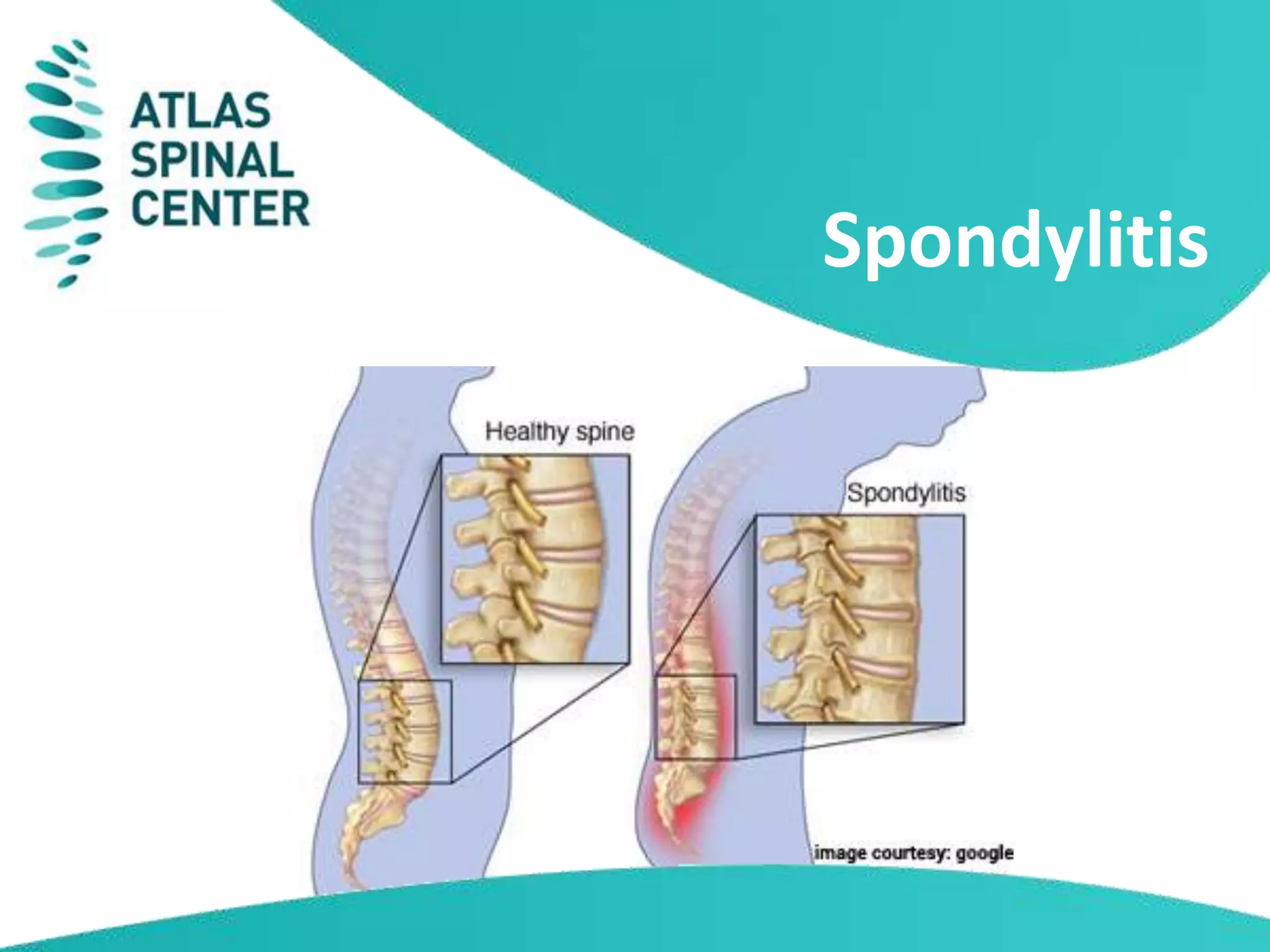 Spondylitis is a condition caused by inflammation of the vertebrae in the spinal cord. It often causes chronic back and neck pain, making daily life difficult. The vertebral joints become inflamed and may fuse together over time, leading to a rigid spine. Symptoms include loss of coordination, stiffness, tingling, numbness, and difficulty moving. Doctors diagnose spondylitis through medical history, physical exam, and imaging tests of the spine. Treatment aims to reduce pain and stiffness through methods like realigning the vertebrae to slow the degenerative process. Lifestyle changes such as quitting smoking, sleeping on a firm mattress, and maintaining good posture can help manage symptoms.