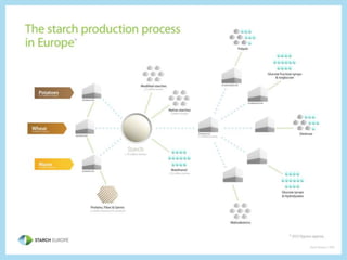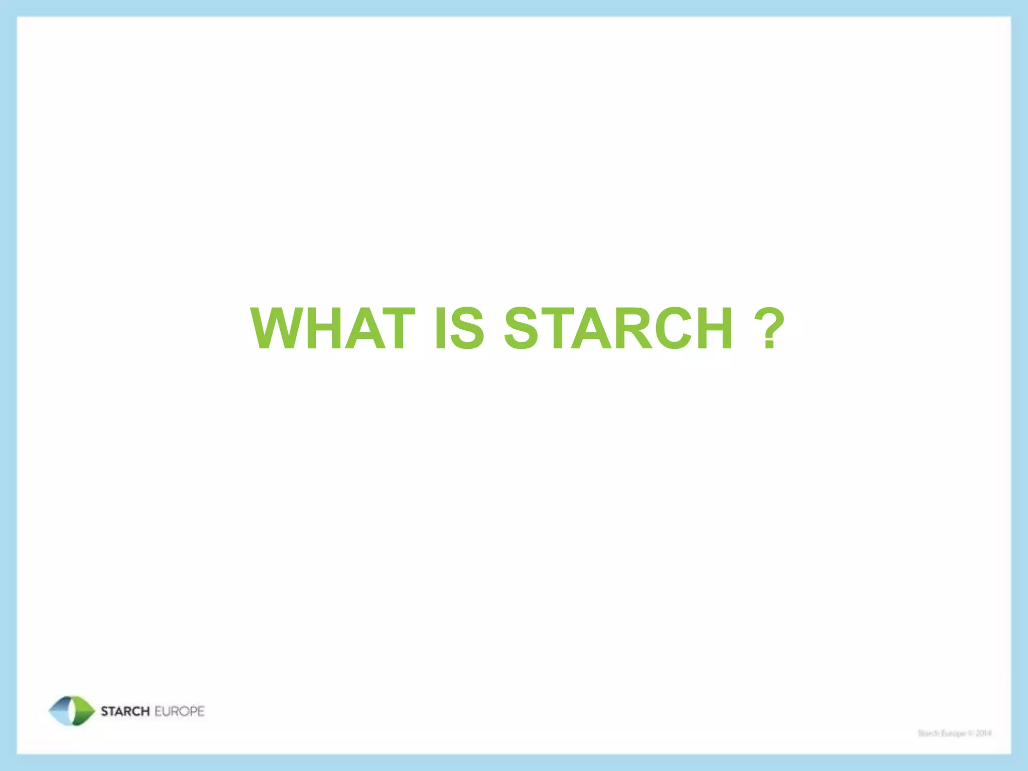 Starch is a carbohydrate made of glucose units joined together that is the primary energy store in plants. It is found in grains like wheat, corn, and rice as well as tubers like potatoes. Pure starch is a white, odorless powder that is insoluble in cold water but can be used in foods or paper. Starch can also be processed into glucose syrups or modified starches used widely in the food industry. Starch has many applications across food, paper products, industrial uses like biofuels, pharmaceuticals, cosmetics, and animal feed due to its functional properties.