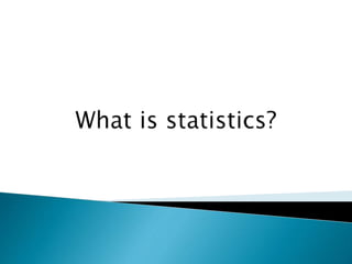 This document discusses statistics and their uses in various fields such as business, health, learning, research, social sciences, and natural resources. It provides examples of how statistics are used in starting businesses, manufacturing, marketing, and engineering. Statistics help decision-makers reduce ambiguity and assess risks. They are used to interpret data and make informed decisions. However, statistics also have limitations as they only show averages and may not apply to individuals.