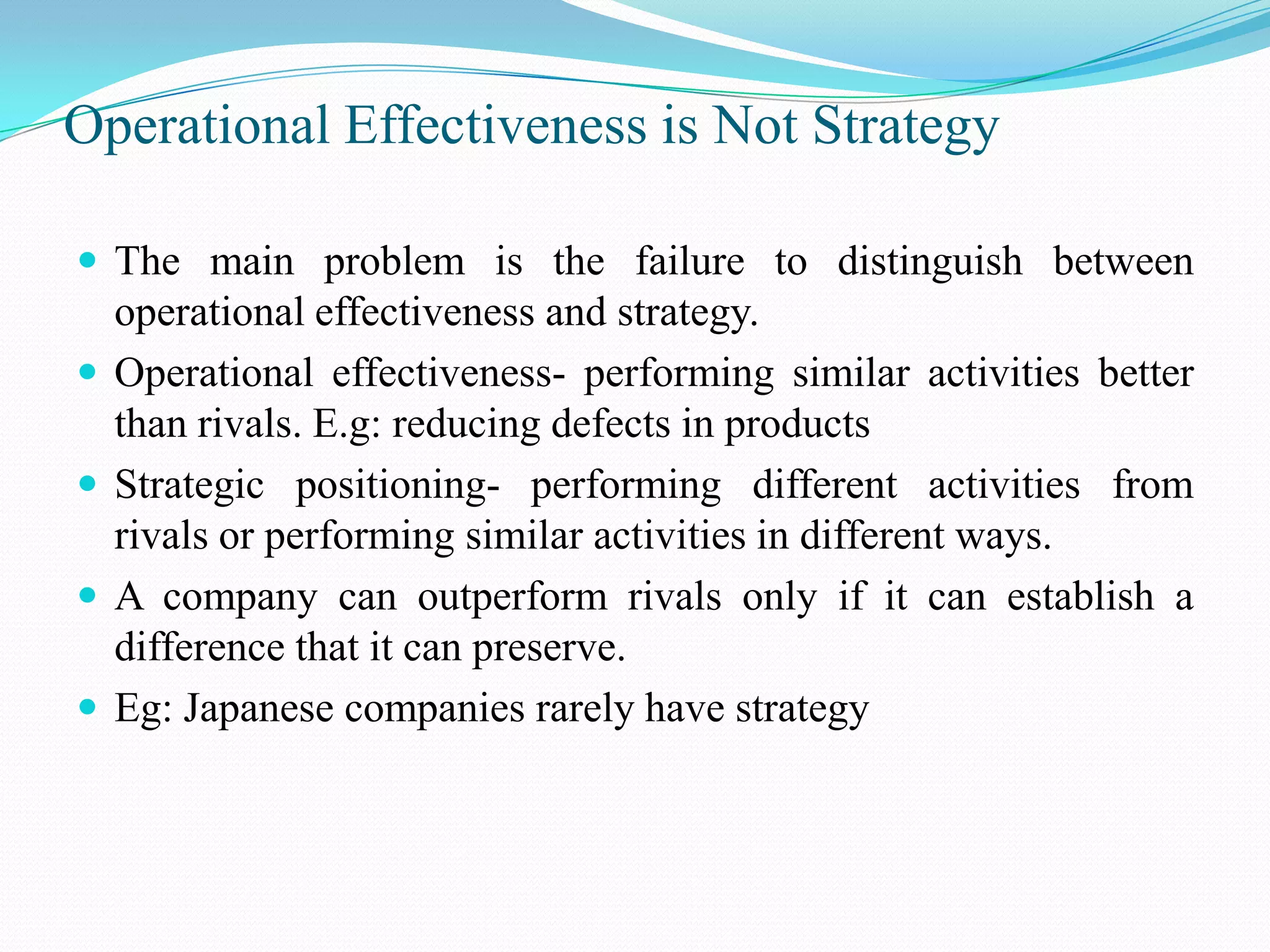 This document discusses the differences between operational effectiveness and strategy. Operational effectiveness means performing similar activities better than rivals, like reducing product defects. Strategy means performing different activities or activities differently to establish a unique position. It also discusses how strategic positioning comes from variety, need, or access-based differences. Finally, it emphasizes that strategy requires trade-offs to make unique choices and be sustainable, and that fit among a company's activities is important for competitive advantage.