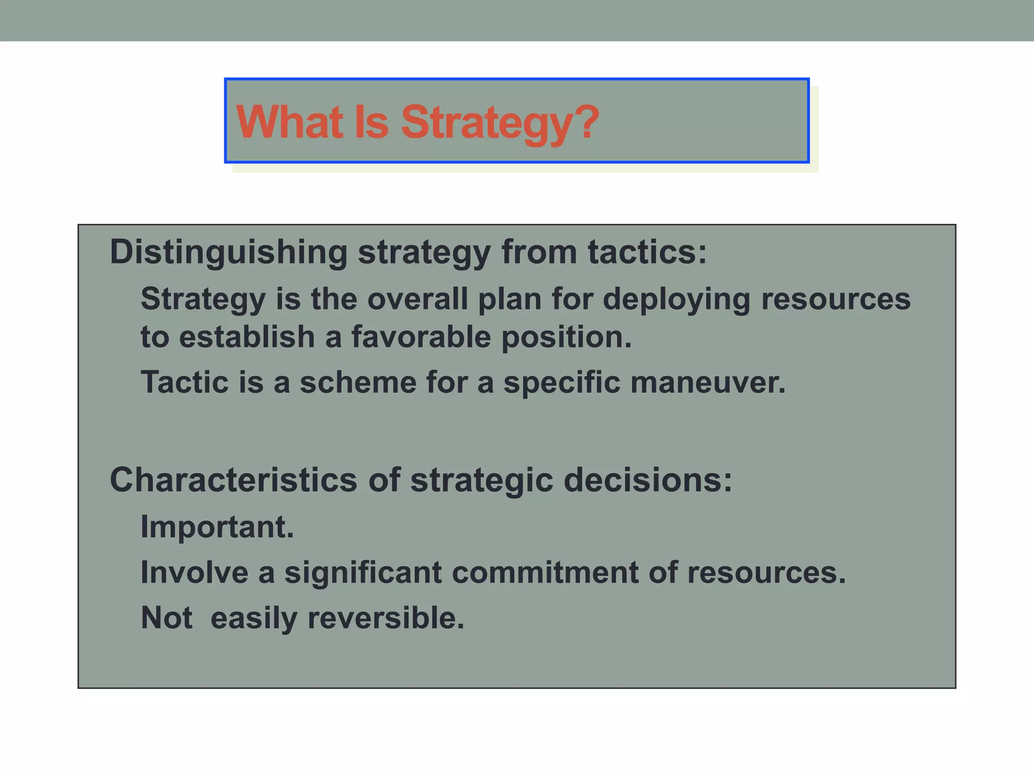 1. Strategy is the overall plan for deploying resources to establish a favorable position, while tactics are specific maneuvers. Strategic decisions are important, involve significant commitments, and are not easily reversible.