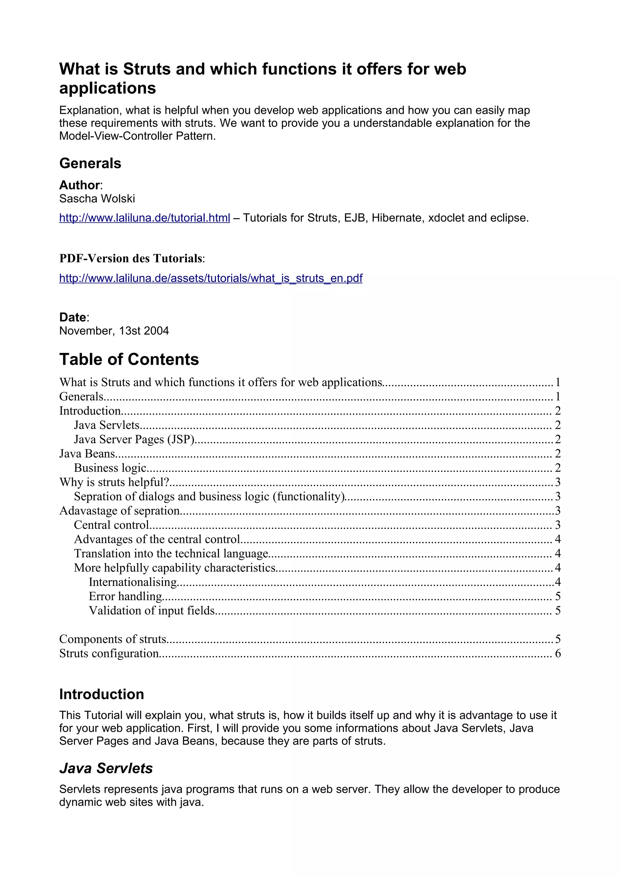 Struts is a framework that uses the MVC pattern to separate the presentation, business logic, and user interface components of web applications. It provides tag libraries and configuration files to help developers build dynamic web applications in Java. Struts handles common tasks like internationalization, validation, and error handling. The framework uses Java servlets as controllers, JavaBeans for the business model, and JSP pages as views. Configuration files map actions to Java classes and views, allowing flexibility. Struts helps enforce separation of concerns and centralizes control of web application workflow and interaction between components.
