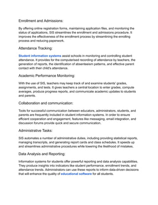 A Student Information System (SIS) is designed for educational institutions to manage student data, facilitating tasks such as enrollment, attendance tracking, academic performance monitoring, and communication among stakeholders. Key features include student records management, course registration, grading, financial management, and integration with other systems. SIS enhances administrative efficiency, data analysis, and parental involvement while ensuring data security and compliance with legal standards.