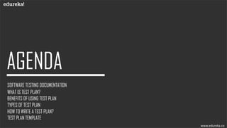 The document discusses the importance of software testing documentation, particularly focusing on test plans, which outline the scope, approach, objectives, and resources required for testing projects. It covers the types of test plans, the significance of a well-defined testing strategy, and the roles and responsibilities of the testing team. Additionally, it emphasizes the necessity of clear documentation to avoid misunderstandings and ensure effective testing processes.