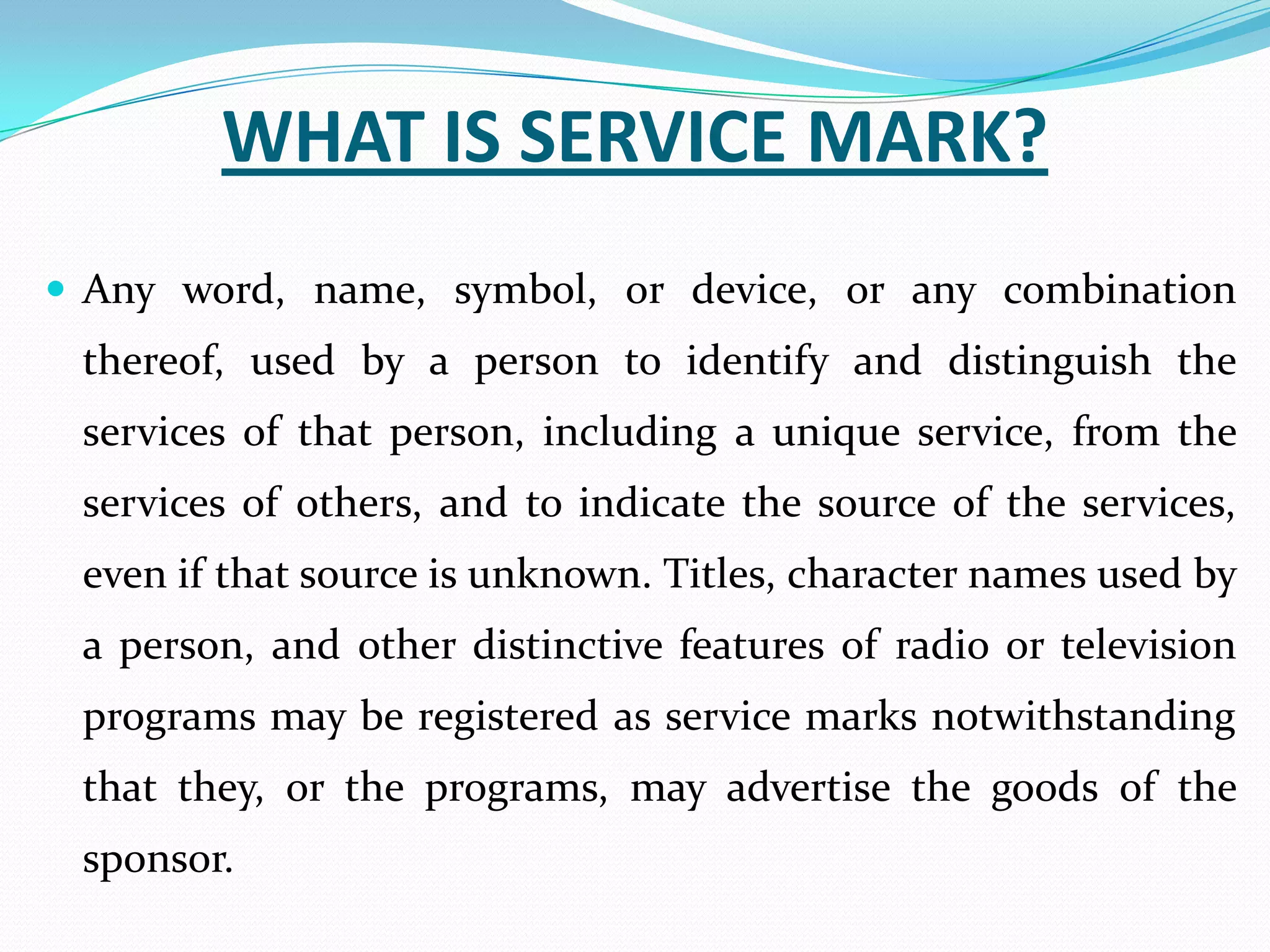 A service mark is a word, name, symbol or device that identifies and distinguishes the source of a service. It can be registered to exclusively identify the services of one business and differentiate those services from competitors. A service mark is used in the advertising or sale of services, whereas a trademark identifies goods. The procedures for registering and rights granted are otherwise the same for trademarks and service marks, except service marks are used to identify services rather than products. Specimens demonstrate how a mark is presented publicly and can include advertisements, flyers or photographs for service marks.