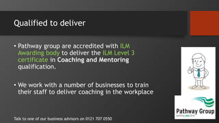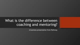 The document outlines the key differences between coaching and mentoring, emphasizing that coaching is short-term, task-oriented, and focused on skill development, while mentoring is long-term, relationship-oriented, and aims for personal and professional transformation. It highlights that coaches have a monetary incentive and a one-way knowledge transfer approach, whereas mentors are volunteer-based, fostering two-way relationships with broader perspectives. Pathway Group is accredited to deliver coaching and mentoring qualifications and offers training to enhance workplace coaching skills.