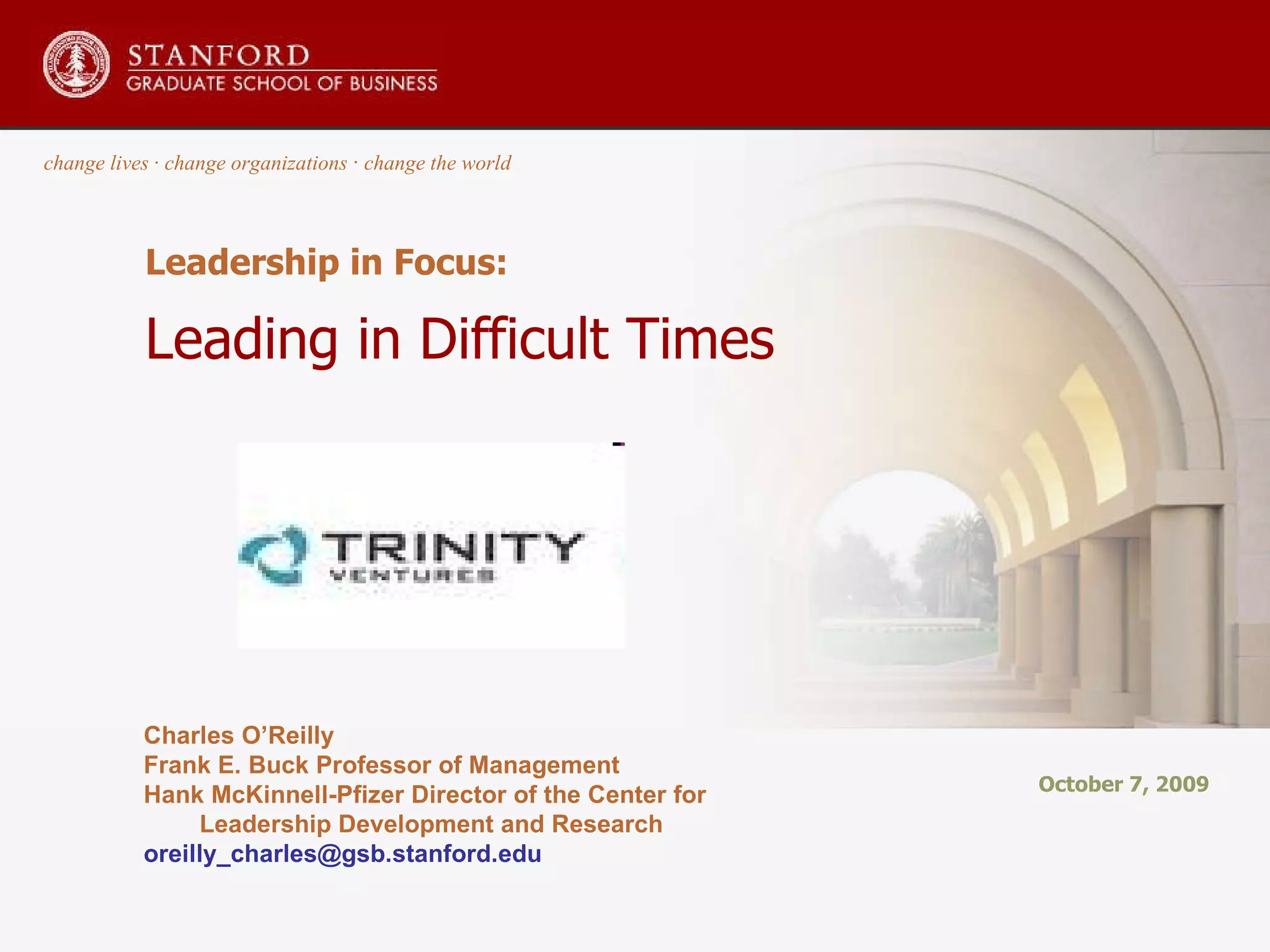 The document discusses leadership challenges during difficult times. It provides examples of leadership challenges faced by CEOs such as downsizing, dealing with uncooperative employees, and leading organizational transformations. The document emphasizes that leadership requires setting a vision, communicating effectively, inspiring people and adapting to change, not just managing tasks. Leaders discussed learning from facing challenges themselves and the importance of relentlessly communicating vision during change.