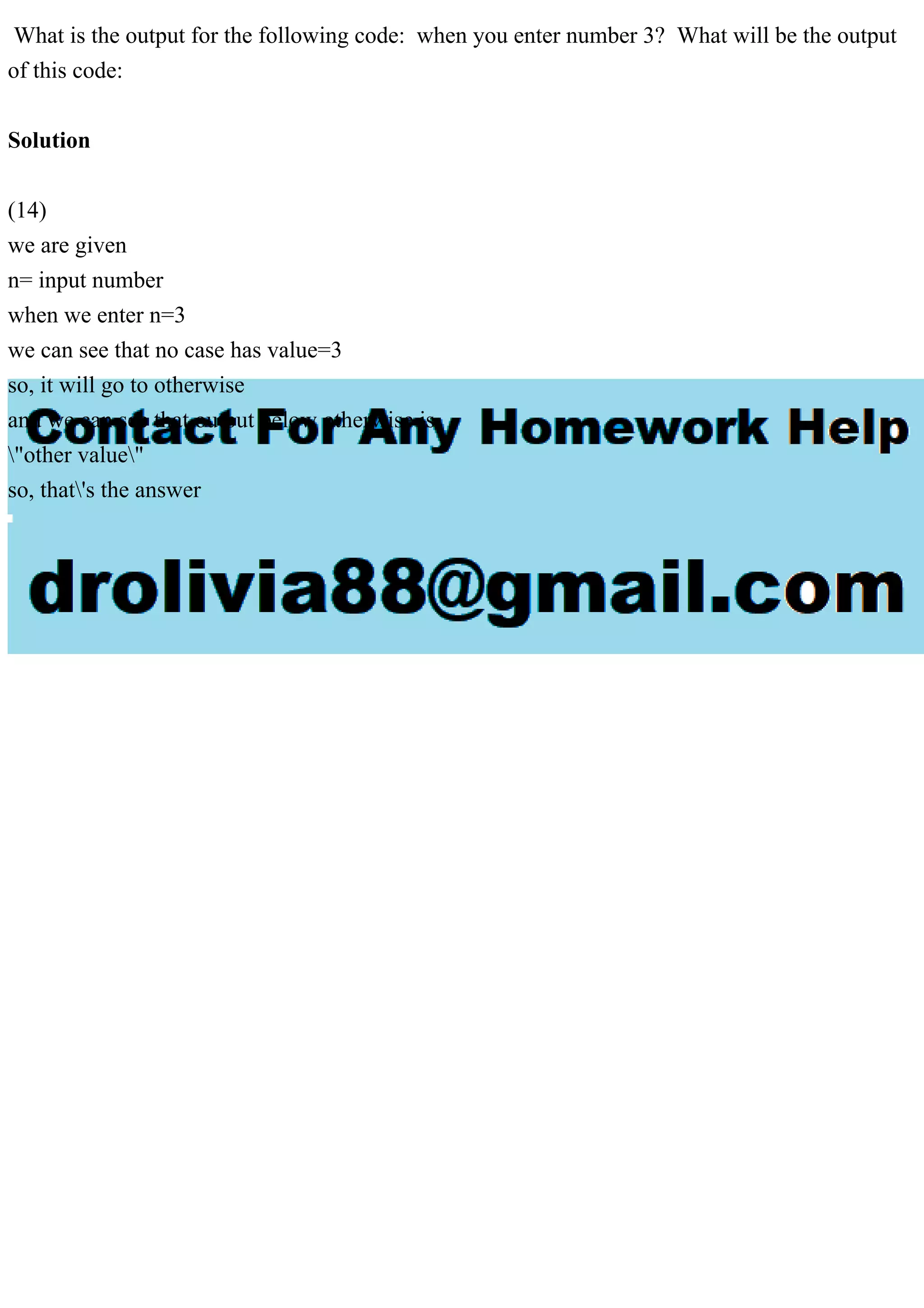 When the input number is 3, the code will not match any specific case and will default to the 'otherwise' output. The result will be 'other value.' Therefore, the answer for input 3 is 'other value.'