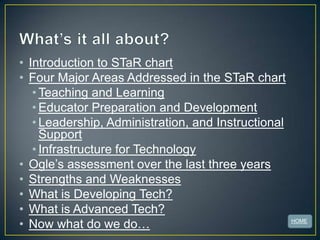 This document discusses Ogle Elementary's assessment of technology integration over the last three years using the STaR chart. It found strengths in infrastructure for technology but weaknesses in teaching and learning, educator preparation, and leadership. The document provides descriptions of developing and advanced levels of technology integration in classrooms and professional development. It emphasizes the need to continue immersing students and teachers in technology to engage students and enhance instruction.