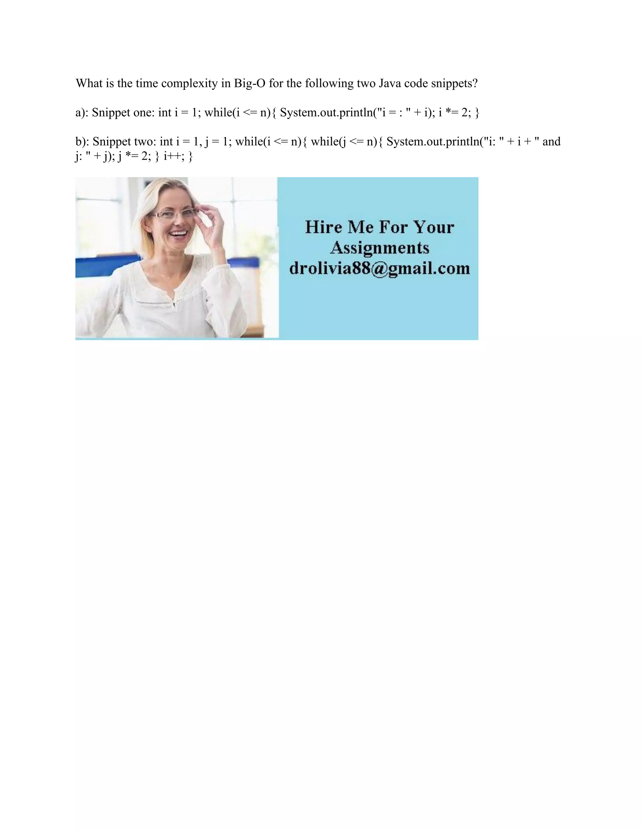 The first code snippet has a time complexity of O(log n) due to the loop doubling 'i' with each iteration. The second snippet has a time complexity of O(n log n) because the outer loop runs 'n' times while the inner loop also runs logarithmically with respect to 'j'. Both snippets output values to the console based on their respective loops.