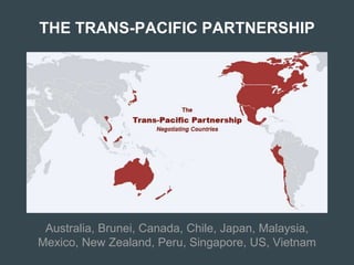 The document discusses the Trans-Pacific Partnership (TPP) agreement and argues that it undermines democracy and workers' rights. It asserts that the TPP would allow corporations to challenge laws and regulations through dispute resolution tribunals. Additionally, it claims the TPP sets rules on many non-trade issues and would force downward harmonization of policies like food safety standards. The document encourages resistance to the TPP's passage.