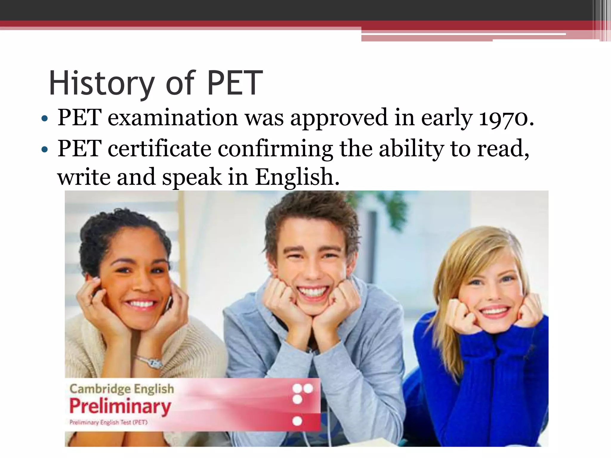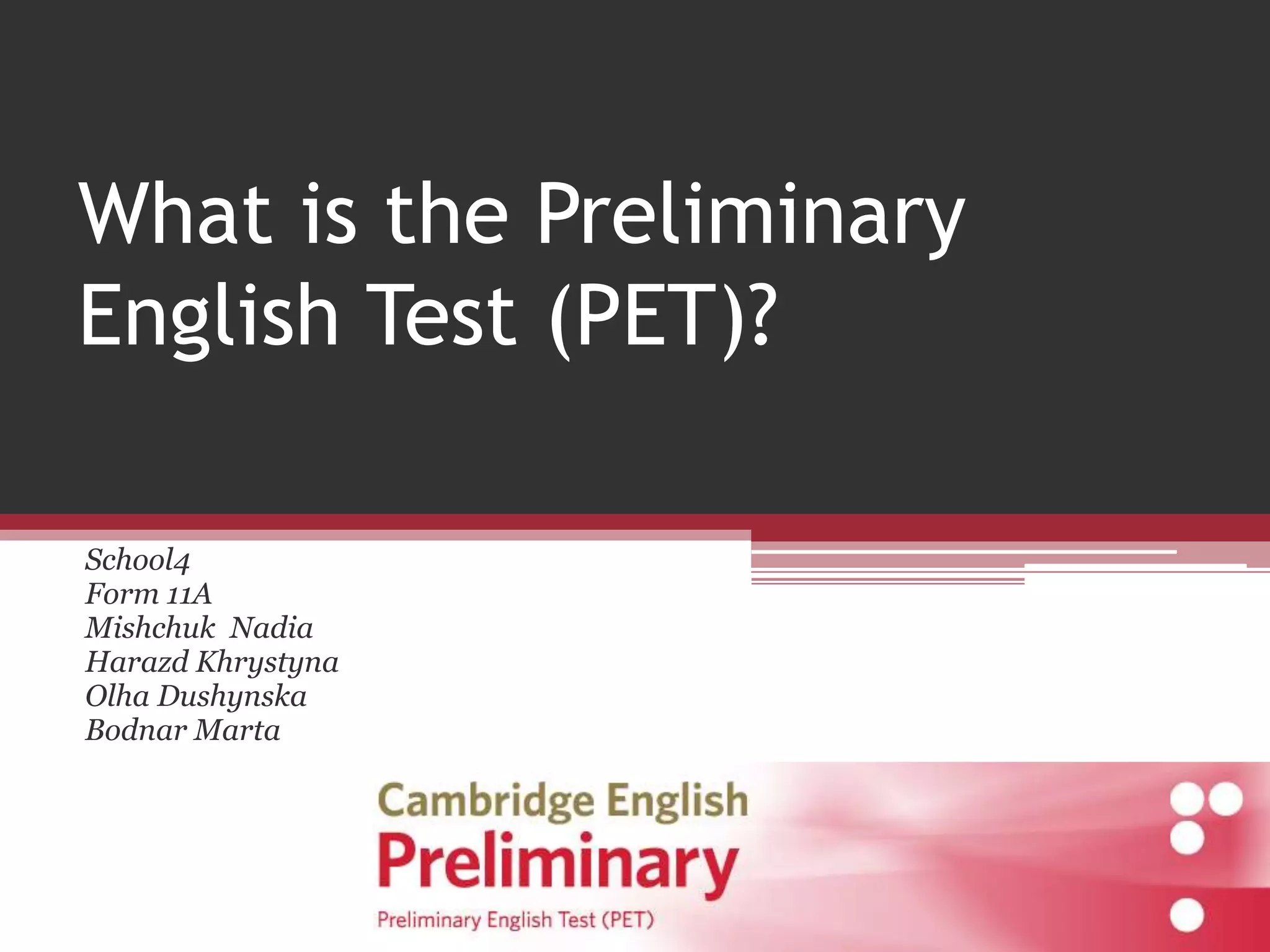 The Preliminary English Test (PET) is an exam that tests intermediate English language skills. It was first approved in the 1970s and certifies that test-takers can read, write, and speak English at a basic level. The PET exam evaluates the four language skills - reading, writing, listening, and speaking. It is internationally recognized as proof of a B1 English proficiency level and can help students in their business and academic pursuits. The exam takes 3 hours and 30 minutes to complete and assesses skills through tasks like choosing pictures to match conversations, answering questions about reading or listening passages, and short conversations between exam-takers. A passing score results in a PET certificate.