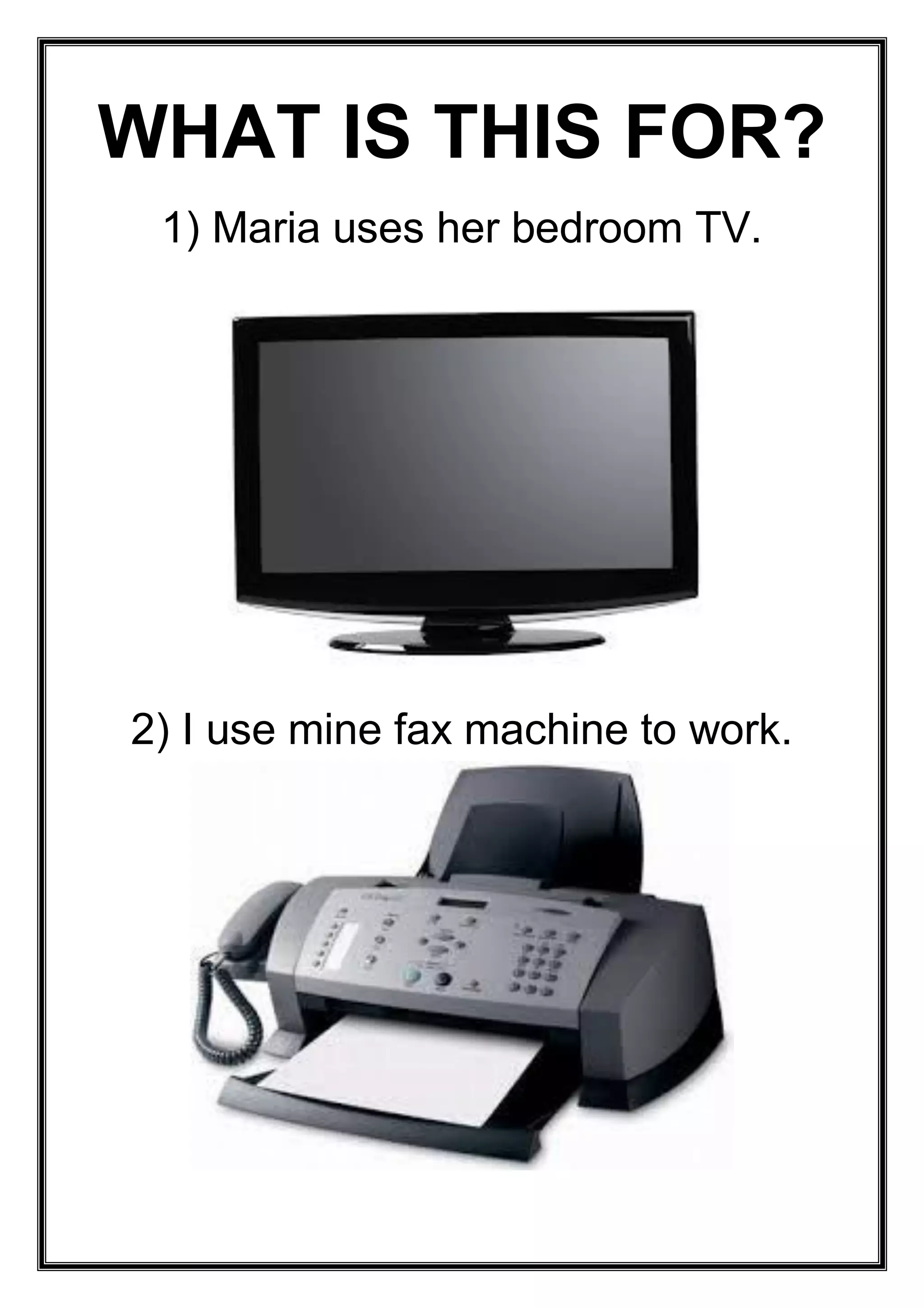 Some people use different devices and objects for different purposes - Maria uses her bedroom TV, I use my fax machine for work, and Peter uses his bike to go to school, while I sometimes use my cell phone and Julia uses her desk for studying.
