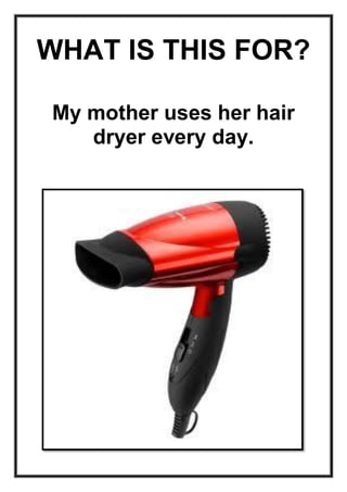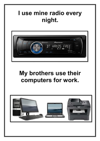 This document describes how different family members use various devices. My mother uses a hair dryer daily, I use a radio nightly, my brothers use computers for work, my father uses a camera on weekends, and my sister uses a card monthly.