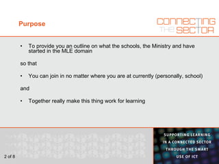 1) The MLE aims to provide a standards-based approach to developing and using online learning tools and resources for schools.