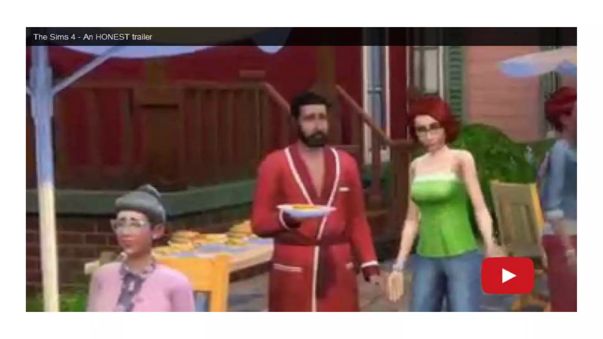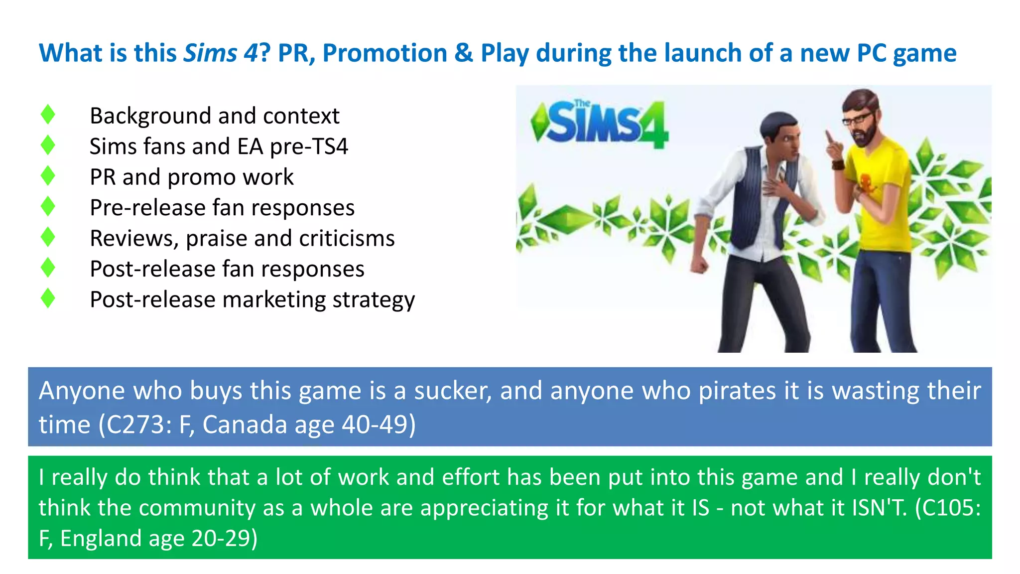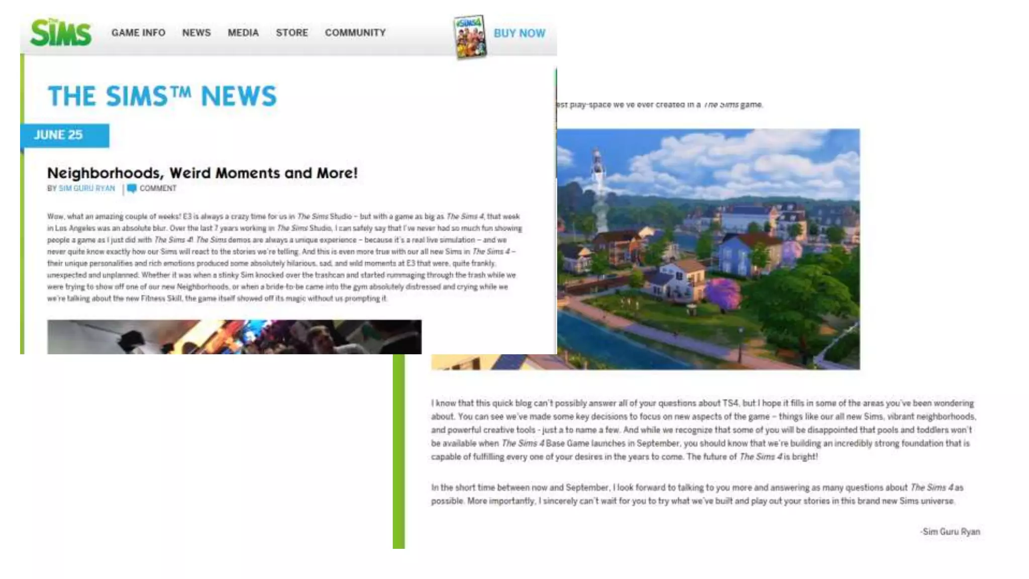 This document discusses the promotion and marketing of The Sims 4 video game by EA during its development and launch. It describes EA's prerelease promotion activities like inviting fan "VIPs" to playtest events. It also discusses fan and reviewer responses to early marketing from EA, some of which were very critical of EA's promotional approach and videos. The document also examines EA's responses to previous game launch failures and broken games. It provides commentary from fans on EA's public relations strategies.