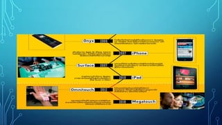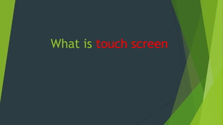 Touch screens are input devices that allow users to interact directly with content displayed on a screen by touching it with a finger or stylus. There are three main types of touchscreen technologies: resistive, surface wave, and capacitive. Resistive touchscreens use two flexible conductive layers separated by small gaps and detect touch by measuring changes in electrical current. Capacitive touchscreens use conductive surfaces and detect touch through changes in capacitance. Touchscreens are now widely used in devices like smartphones, tablets, and laptops to provide intuitive interfaces.
