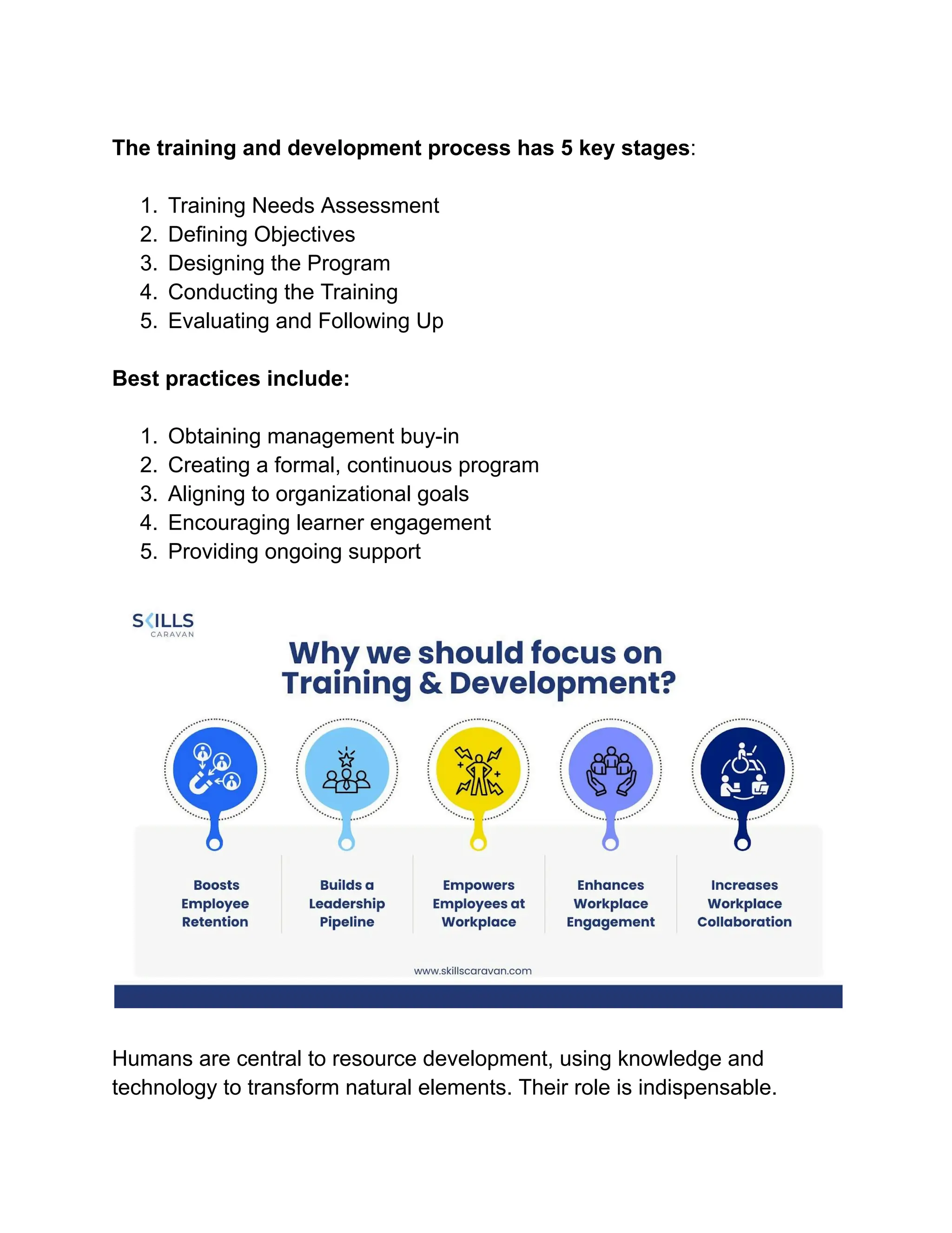 Training and development in human resource management (HRM) encompasses educational activities aimed at enhancing employee skills and knowledge, with key objectives like improving retention, building leadership, empowering employees, and enhancing engagement. The process consists of five stages: needs assessment, defining objectives, program design, training execution, and evaluation. Best practices include securing management support, creating continuous programs, aligning with organizational goals, fostering engagement, and offering ongoing support.