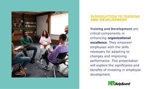 The document discusses the critical role of training and development in enhancing organizational excellence by empowering employees and improving performance. It highlights the importance of training in employee engagement, the various types of training programs available, and the benefits of investing in development initiatives, including increased retention and job satisfaction. Additionally, it addresses the influence of training on organizational culture and the challenges faced in implementation, emphasizing the need for strategic planning to foster a supportive learning environment.