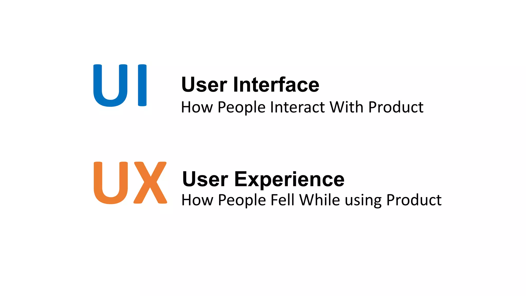The document outlines the differences between User Interface (UI) and User Experience (UX) design. UX focuses on how the product feels and user interaction, whereas UI emphasizes the visual layout and communication of the product. It also highlights the responsibilities of UX and UI designers and methods they use, such as user testing and creating visual elements.