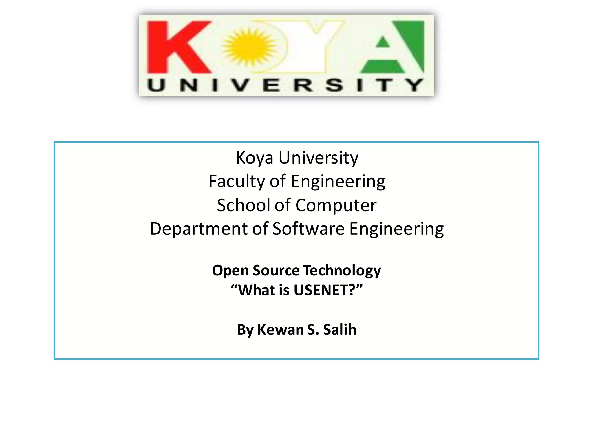 Koya University's Department of Software Engineering discusses a document by Kewan S. Salih titled "What is USENET?". The document defines USENET as a worldwide distributed Internet discussion system developed in 1980 at universities in North Carolina and derived from early Unix networking technology. USENET consists of publicly accessible newsgroups on specific topics, with articles transmitted similarly to email between computers using communication protocols.