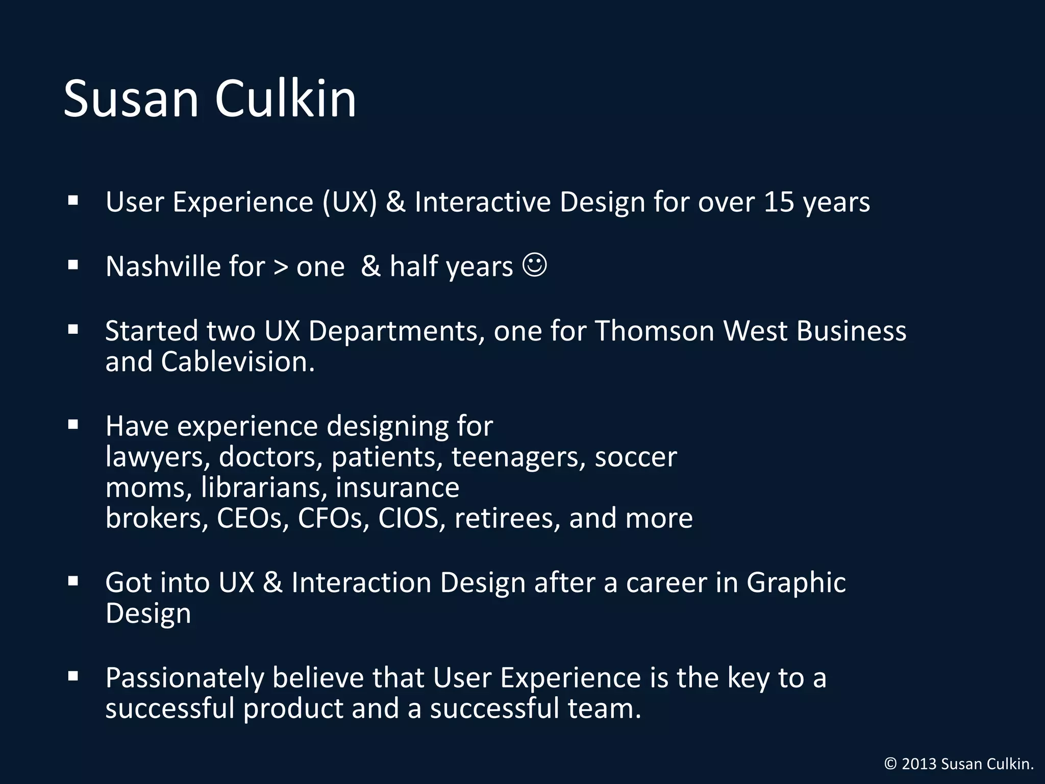 The document discusses the importance of user experience (UX) in product design, emphasizing that it balances user needs with business goals to ensure design feasibility. It outlines the UX design process as a cycle of research, design, testing, iteration, and validation, while highlighting the benefits of effective UX, such as reduced costs, increased revenue, and shortened time to market. The author, Susan Culkin, also provides insights into best practices and resources for UX design.